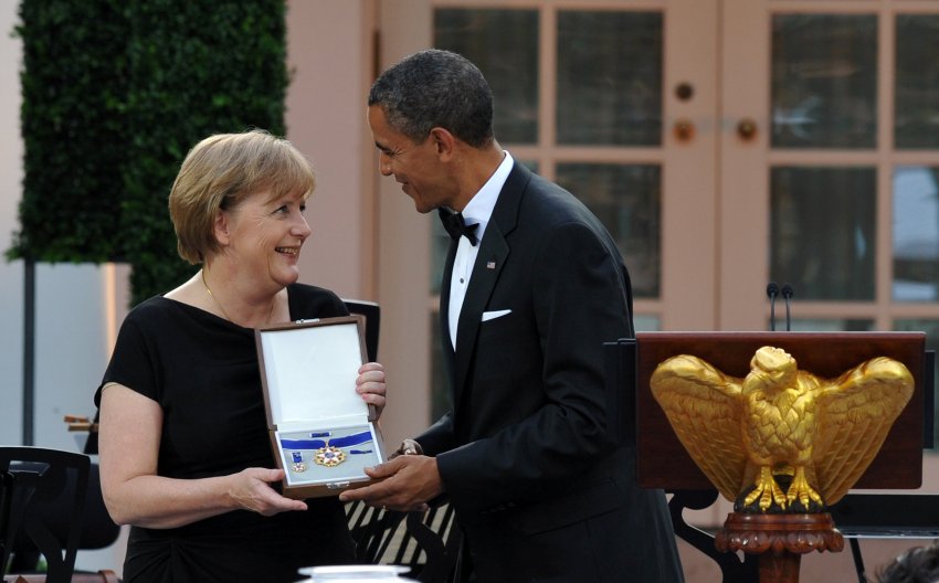 Die Medal of Freedom wird Bundeskanzlerin Angela Merkel (CDU)durch den Präsidenten der Vereinigten Staaten, Barack Obama am Dienstag (07.06.2011) im Weißen Haus in Washington (USA) verliehen. Zum Abschluss ihres Besuches erhielt die Kanzlerin die Freiheitsmedaille, die höchste zivile Auszeichnung der USA. Foto: Rainer Jensen dpa +++(c) dpa – Bildfunk+++