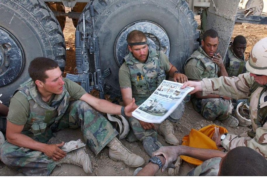 During the 2003/2004 deployment to Iraq, Stars and Stripes reporters and other news agencies were imbedded with our troops who had deployed from Friedberg, Germany. I served those troops as a DoD contractor with the Overseas Military Banking Program. My job was to manage the small banking facility on Ray Barracks, Friedberg. Ray Barracks hosted Sgt. Elvis Aaron Presley from 1958-1960. In the late 90’s it became home to the 1st BDE, 1st AD. These were the soldiers who in 2003 deployed to Baghdad. During that deployment, my staff and I created “News from the front”, daily Stars and Stripes stories directly involving our brigade and deployed soldiers which we painstakingly cut and glued onto a flip chart which stood in the entrance to the bank lobby. A throwback to past wars, The Stars and Stripes became a conduit between loved ones down range and military families that remained at “home” in Germany.