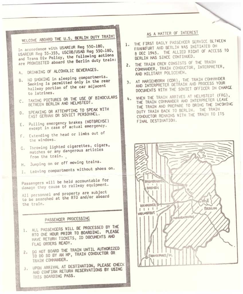 Duty Trains traveled all across Germany between garrisons and occupied allied sectors and locations. The Duty Train to Berlin was more interesting than most because it crossed from West Germany through East Germany to its final destination in West Berlin. With limited space and capacity, those of us eager to travel to Berlin signed up days in advance. We were issued travel orders written in English, French, and Russian. We were briefed in detail on security and safety protocols that would eliminate any possibility of a Cold War “incident”. As the train approached the East German border, it stopped at the last station in the West (Helmsted) long enough to swap the engine for an East German one (diesel), and for a Russian interpreter to come aboard. With window shades down, and strict security protocols in place, we were on our way to Berlin. On arrival to Berlin, we still had to stop at the first East Berlin control point where East German & Russian guards scanned the undercarriage with mirrors and led K9’s around the train for possible stowaways.